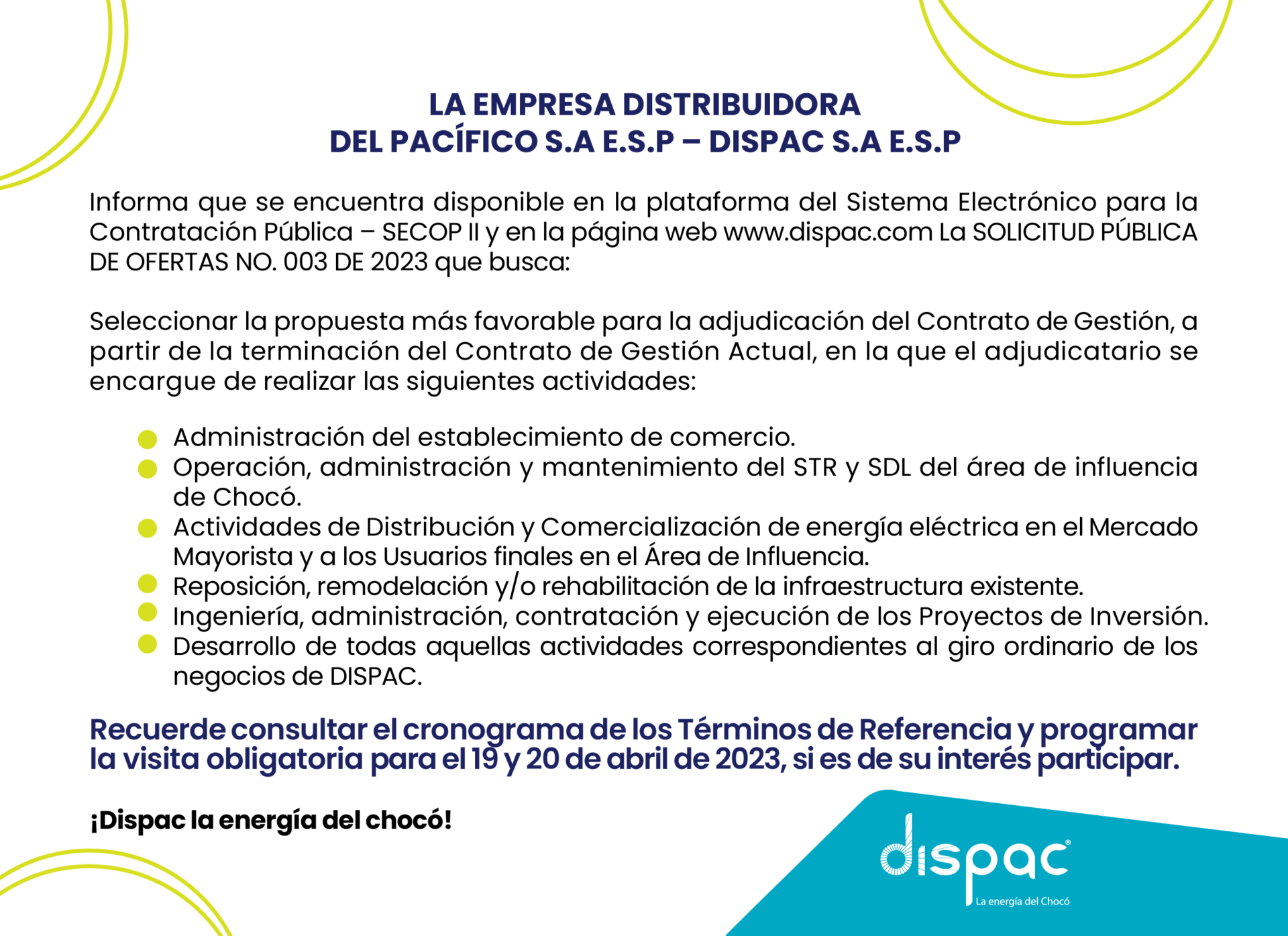Términos de Referencia del Proceso SPO-DG-003-2023 para Seleccionar la propuesta más favorable para la adjudicación del Contrato de Gestión, a partir de la terminación del Contrato de Gestión Actual, en la que el adjudicatario se encargue pero sin limitarse, a realizar las siguientes actividades: (a) La administración del establecimiento de comercio; (b) La operación, administración y mantenimiento de los activos de transmisión regional (STR) y distribución local (SDL) de DISPAC, en los términos previstos en el Contrato de Gestión y sus anexos respectivos; (c) Las actividades de Distribución y Comercialización de energía eléctrica en el Mercado Mayorista y a los Usuarios finales en el Área de Influencia y ; (d) La reposición, remodelación y/o rehabilitación de la infraestructura existente; (e) La ingeniería, administración, contratación y ejecución de los Proyectos de Inversión; y (f) El desarrollo de todas aquellas actividades correspondientes al giro ordinario de los negocios de DISPAC que en el Contrato no se asignen expresamente a DISPAC de tal manera que se asegure la prestación ininterrumpida y de calidad del Servicio Público de Energía en el área de influencia