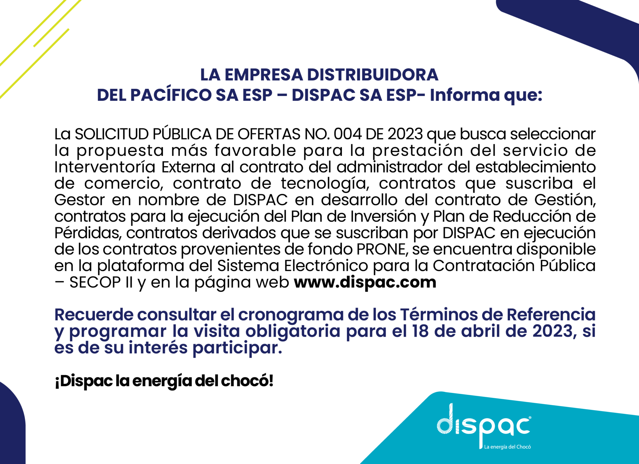 Términos de Referencia del Proceso SPO-DG-004-2023 para seleccionar la propuesta más favorable para la prestación del servicio de Interventoría Externa Interventoría técnica, financiera, contable, jurídica, ambiental, social, predial, administrativa, de seguros, de mantenimiento o de cualquier otra actividad derivada del administrador del establecimiento de comercio, contrato de tecnología, contratos que suscriba el Gestor en nombre de DISPAC en desarrollo del contrato de Gestión, contratos para la ejecución del Plan de Inversión y Plan de Reducción de Pérdidas, contratos derivados que se suscriban por DISPAC en ejecución de los contratos PRONE/FAER