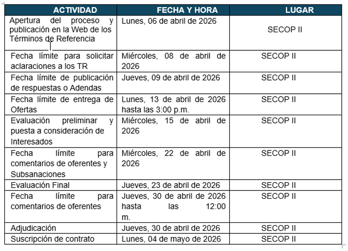 Las fechas y plazos proyectados para el presente proceso de contratación son las siguientes: