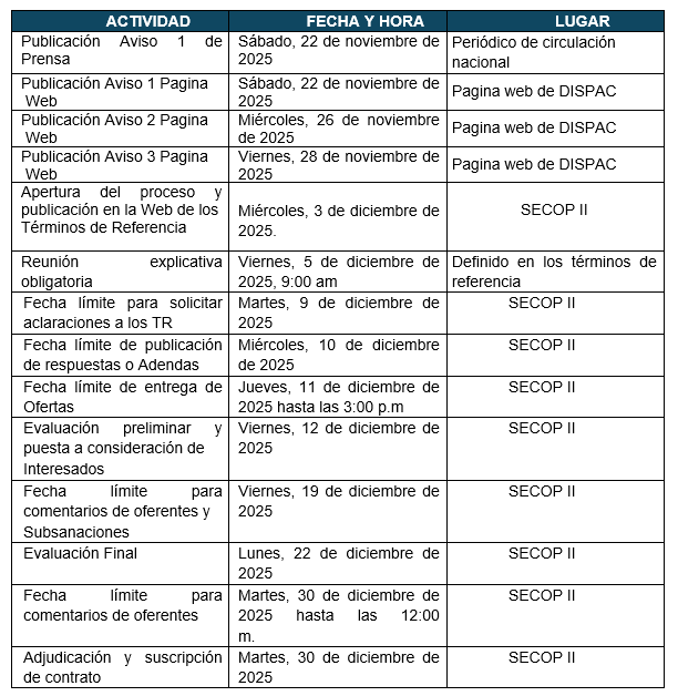 Las fechas y plazos proyectados para el presente proceso de contratación son las siguientes: